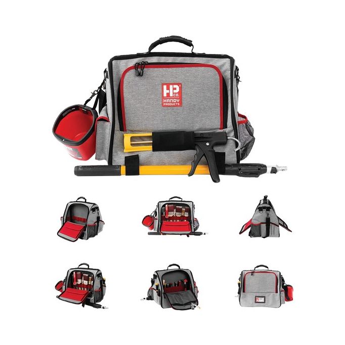 The Handy Painters Tool Bag DELUXE helps painters to stay organized and get the job done right. The ultra-durable, water-resistant tool bag is built to last and keep tools organized. The DELUXE bag can carry a painter's entire arsenal as well as larger accessories. Numerous storage compartments are designed to keep tools conveniently organized and protected in one location. Storage for applicators, spray tips, tape, paint pails, screwdrivers, caulking guns, extension poles, phones and water bottles is included in a compact, easy-to-carry design.