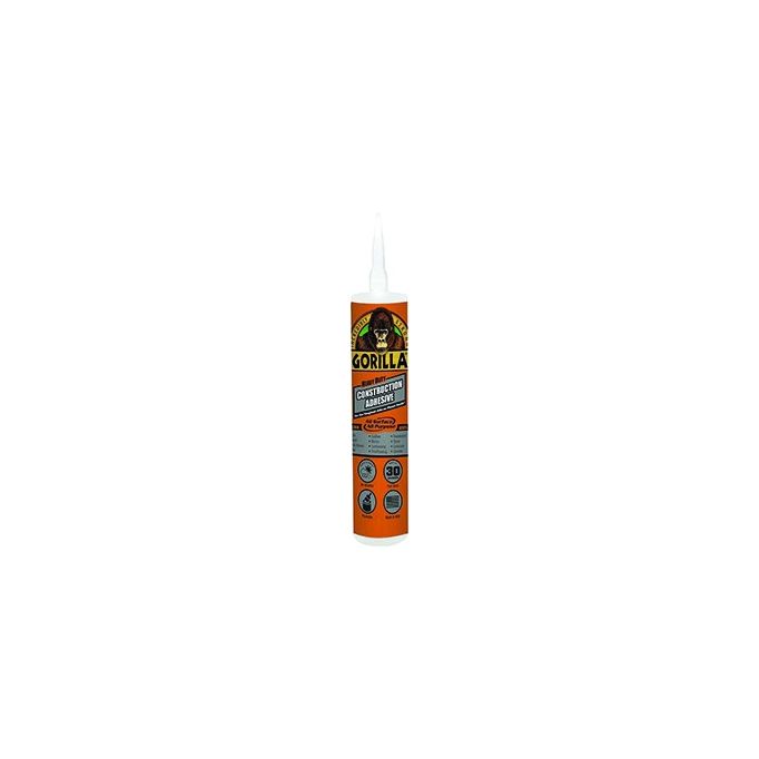 Gorilla Heavy Duty Construction Adhesive is a tough, versatile, all-weather adhesive. Unlike other construction adhesives, it's 100% adhesive formula provides a long-lasting, heavy duty bond. The gap-filling, durable, 100% waterproof adhesive formula is perfect for indoor and outdoor projects, holds in 30 seconds, and bonds virtually anything including subfloor, mirrors, trim, drywall, landscaping, bath surrounds, foamboard, marble and more!