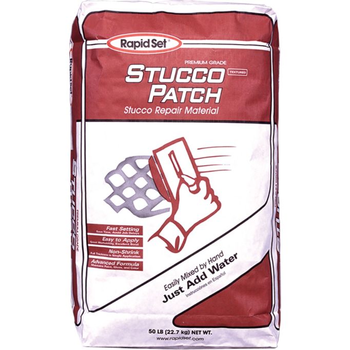 Rapid Set Stucco Patch is a durable, fast setting patching material for stucco repair. When mixed with water, Stucco Patch produces a rich, easy to apply mixture with excellent bonding characteristics. Stucco Patch is formulated with a premium grade hydraulic cement, high performance water-soluble polymers, and high quality aggregates.